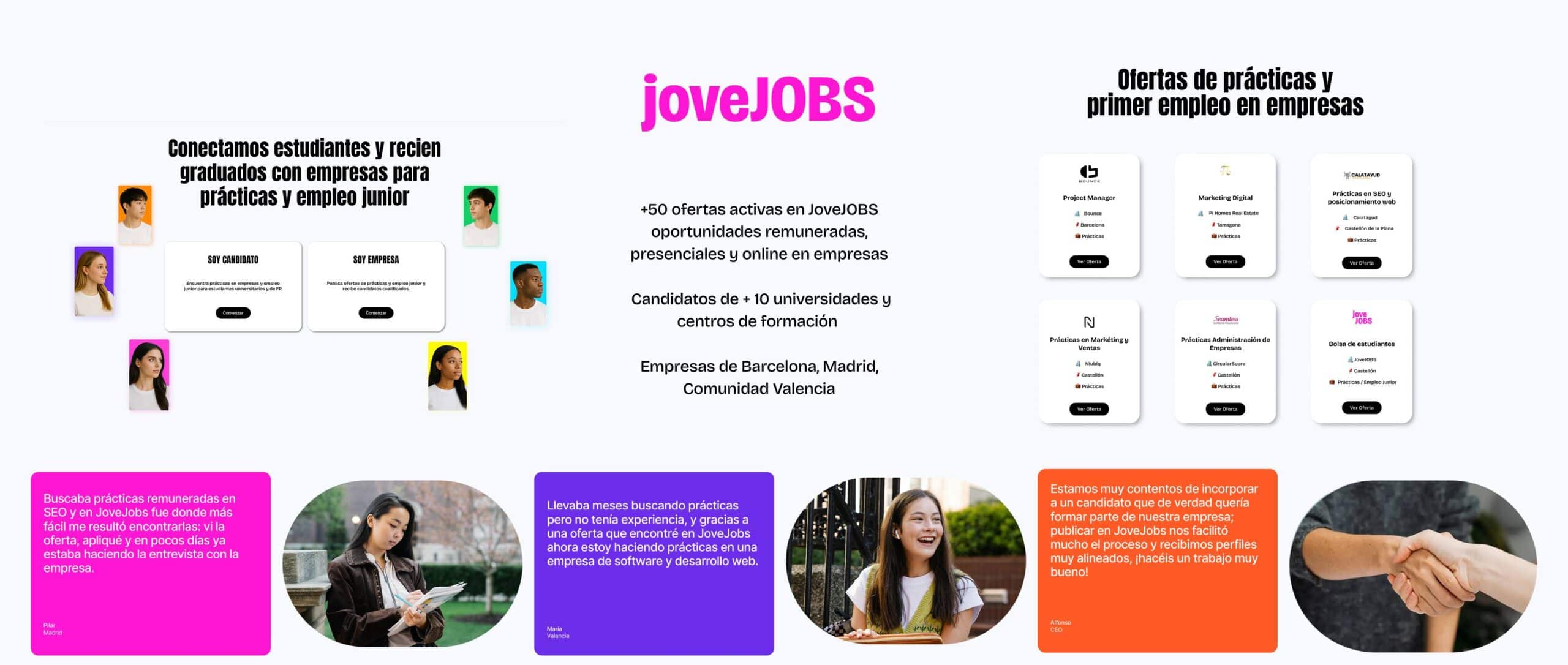 En JoveJobs (https://jovejobs.com/), los candidatos pueden registrarse en la plataforma, aplicar a las ofertas activas o inscribirse en la bolsa de estudiantes para recibir oportunidades acordes a su perfil y postular cuando aparezca una oferta de su interés. A día de hoy, JoveJobs cuenta con más de 500 candidatos inscritos, una cartera de más de 20 empresas y más de 40 ofertas publicadas de prácticas y primer empleo. Además, JoveJobs colabora con más de 10 instituciones públicas y privadas en España para mejorar el acceso de sus estudiantes a prácticas y empleo junior de calidad, entre ellas universidades y centros de formación profesional.