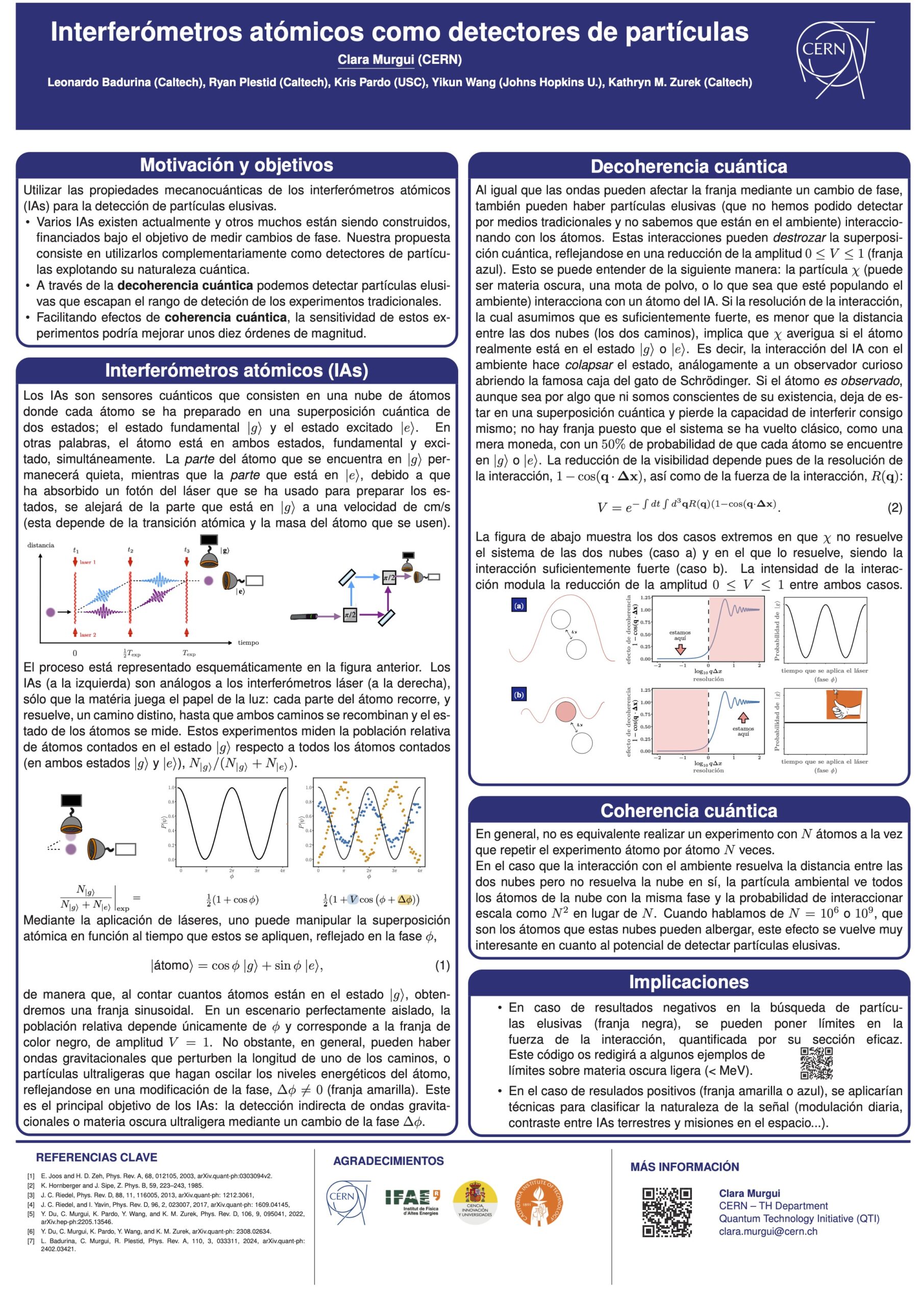 Actualmente, el CERN me ha contratado para continuar desarrollando este proyecto y estudiar este tipo de fenómenos de coherencia y decoherencia cuántica desde el punto de vista teórico, pudiéndolo contrastar las predicciones obtenidas con resultados obtenidos en con interferómetros atómicos. El objetivo de este proyecto es el de tejer una estructura teórica que permita conectar el efecto de partículas de nueva física con las señales observadas en este tipo de experimentos, así como estudiar el “ruido” que nuevas partículas, o partículas que ya conocemos y no pueden aislarse completamente del experimento, puedan causar (afectándo las franjas medidas) en la búsqueda de ondas gravitacionales.