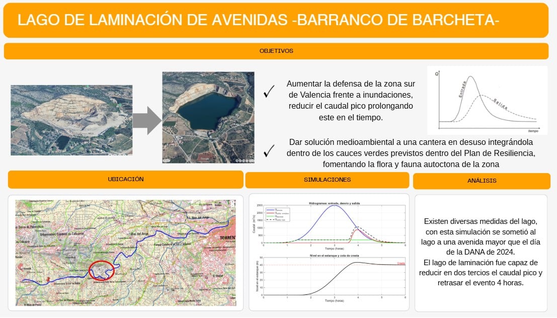 Estudio y diseño de una lago de laminación en la cantera de Calicanto que gestionaría episodios de avenida en el barranco de la Barcheta, afluyente del barranco del Poyo en la localidad de Torrente. Este proyecto pretende trabajar en conjunto con el Plan Resiliencia del gobierno frente a las inundaciones y demuestra ser funcional en las simulaciones matemáticas.