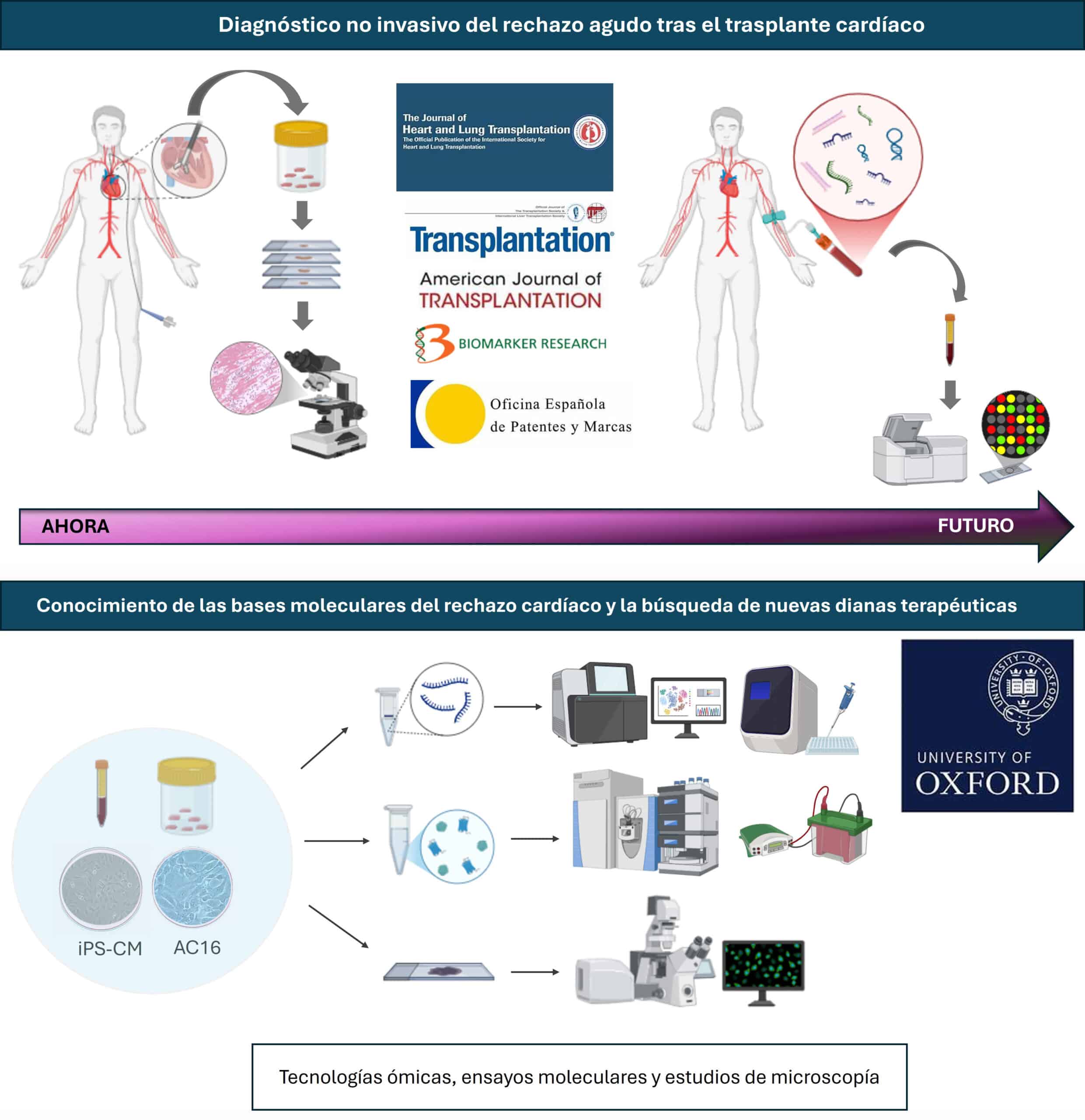 Los pasos actuales y futuros se encuentran dirigidos a la generación de un panel molecular integrando los diferentes RNAs identificados hasta el momento para poder detectar el rechazo cardíaco de forma robusta, como un prototipo para la implementación clínica en todos los hospitales trasplantadores del mundo. A través de la concesión del proyecto de Medicina de Precisión (PMPTA/00184 Instituto de Salud Carlos III-CDTI) en colaboración con la empresa valenciana Seqplexing, especializada en la construcción de paneles de marcadores. Además, de profundizar en el conocimiento de las bases moleculares del rechazo cardíaco y la búsqueda de nuevas dianas terapéuticas, mediante la concesión de mi primer proyecto como investigadora principal (MV24/00099, del Instituto de Salud Carlos III). Actualmente estoy realizando una estancia postdoctoral durante 2025 en la División de Medicina Cardiovascular de la Universidad de Oxford, con la finalidad de aprender e implementar metodologías innovadoras debido a la amplia experiencia del Grupo de Oxford (Moreira LM, et al. Nature. 2020) en estudios in vitro, in vivo y en nuevas tecnologías, como la secuencia del RNA procedente de célula única, que permite describir alteraciones específicas de los diferentes tipos celulares presentes en el tejido cardíaco.