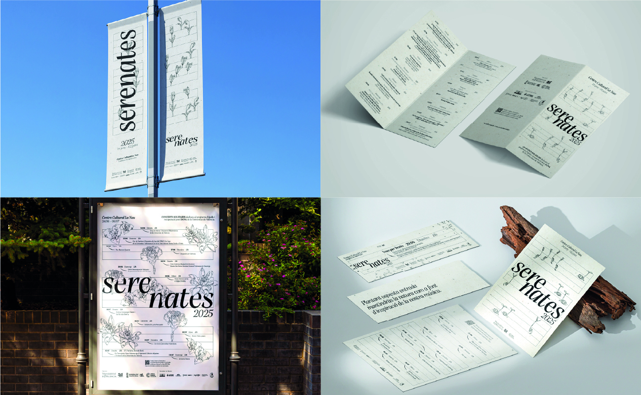Campaña gráfica de comunicación para la edición de 2025 del festival de música valenciana Serenates. Las flores son uno de los elementos característicos de la ciudad de Valencia y ocupan un lugar muy especial en miles de piezas musicales de tradición valenciana. Por esta misma razón, esta campaña se centra en el clavel, el azahar y la buganvilla, mostrando cómo estas flores son uno de los temas que han inspirado a los autores de la tierra a escribir muchas de sus obras.