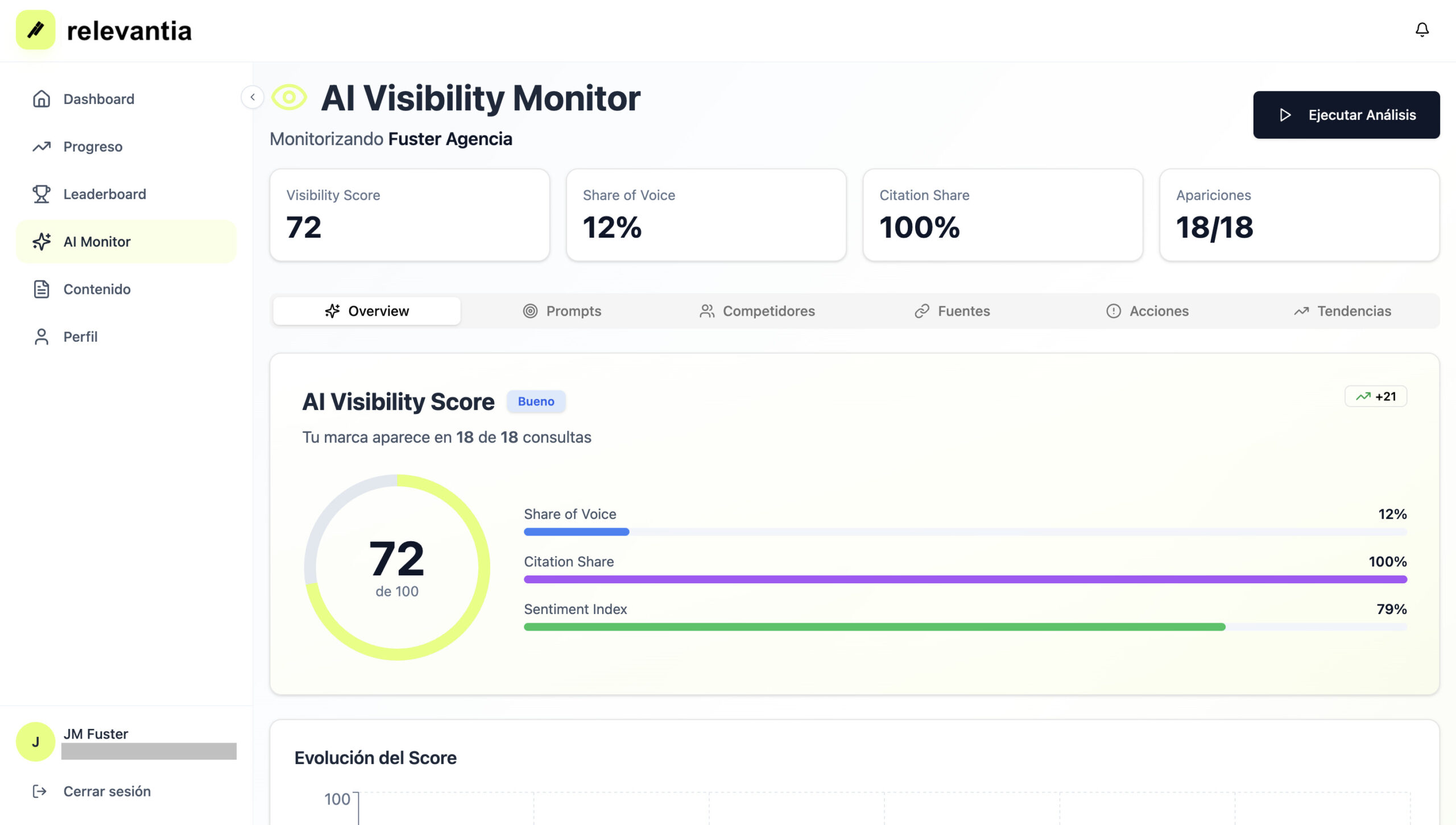 Relevantia.ai es una plataforma SaaS creada en Valencia cuyo objetivo es ayudar a autónomos y pymes a mejorar su visibilidad y posicionamiento en las inteligencias artificiales (como ChatGPT, Gemini o Perplexity), un nuevo canal clave de descubrimiento y recomendación de negocios.